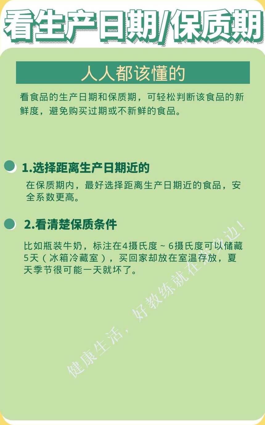 看食品的生產(chǎn)日期和保質(zhì)期,可輕松判斷該食品的新鮮度,避免購買過期或不新鮮的食品。